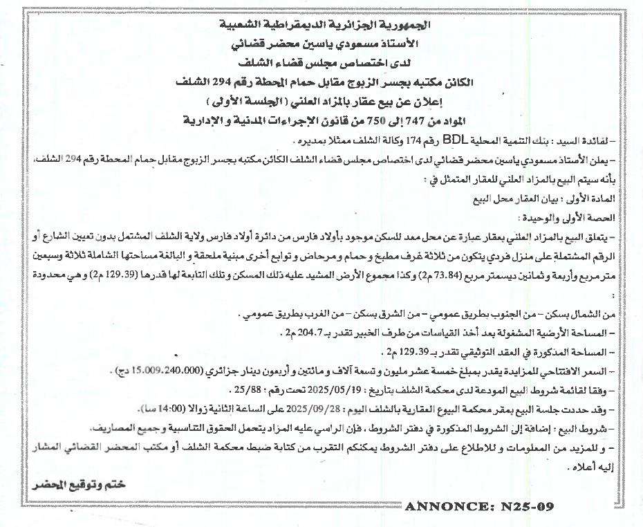 Il sera procédé à la vente au plus offrant et dernier enchérisseur le :
