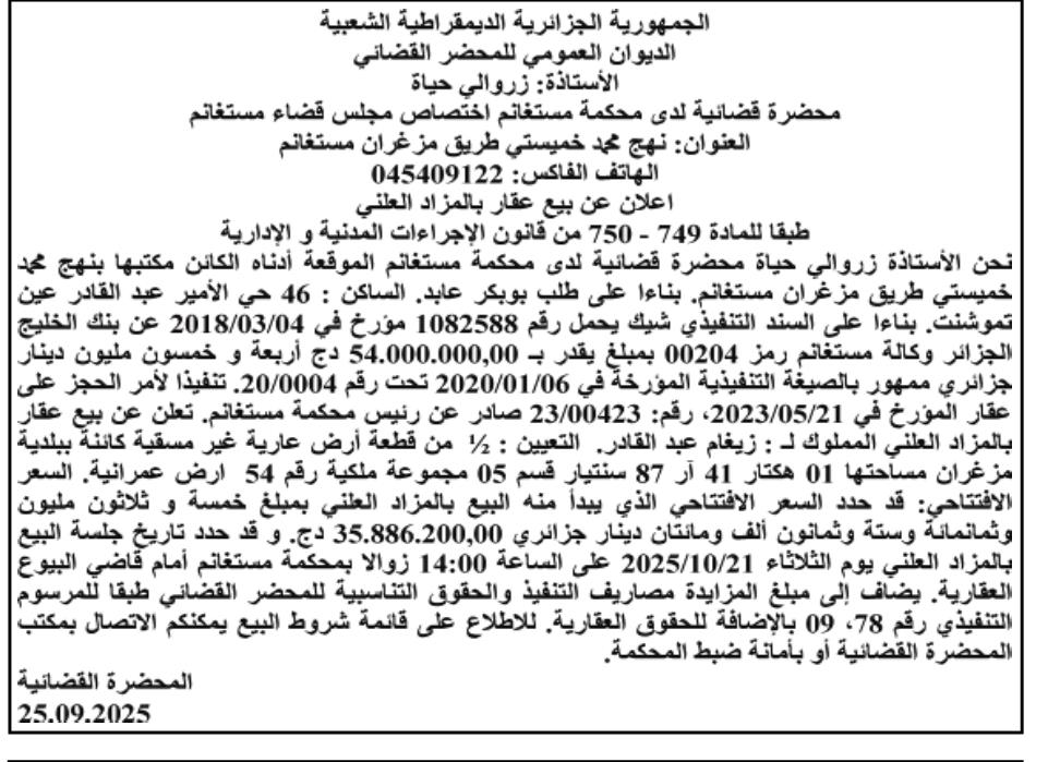 Il sera procédé à la vente au plus offrant et dernier enchérisseur le : 21/10/2025';