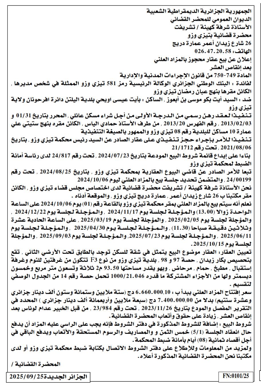Il sera procédé à la vente au plus offrant et dernier enchérisseur le :