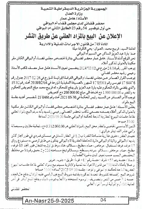 Il sera procédé à la vente au plus offrant et dernier enchérisseur le :