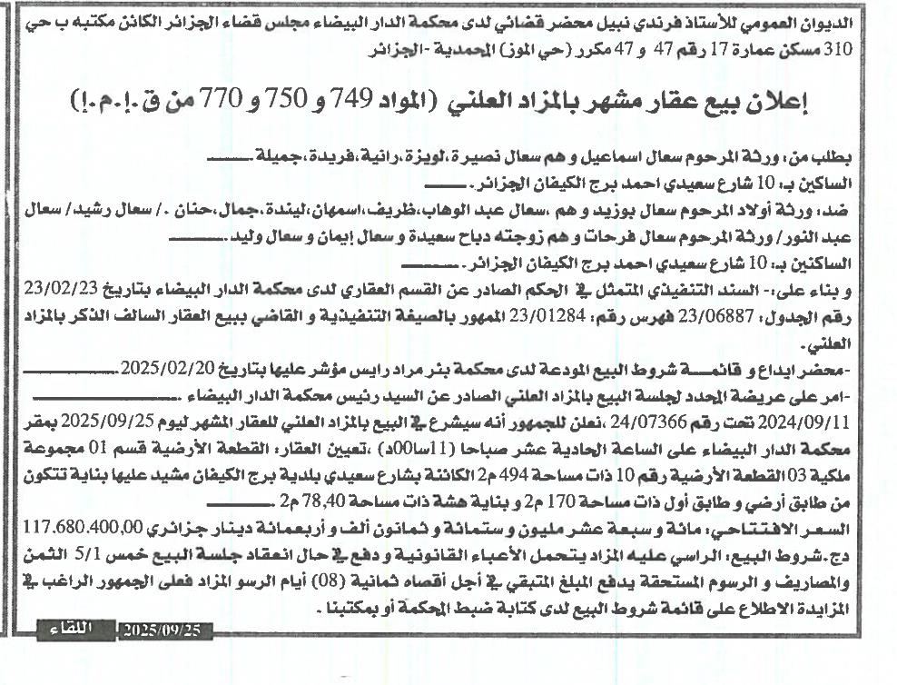 Il sera procédé à la vente au plus offrant et dernier enchérisseur le :