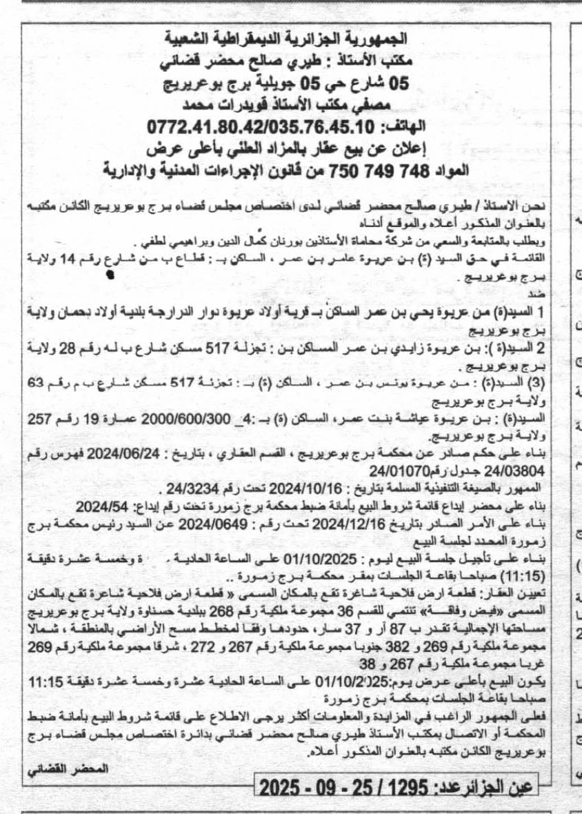 Il sera procédé à la vente au plus offrant et dernier enchérisseur le : 01/10/2025