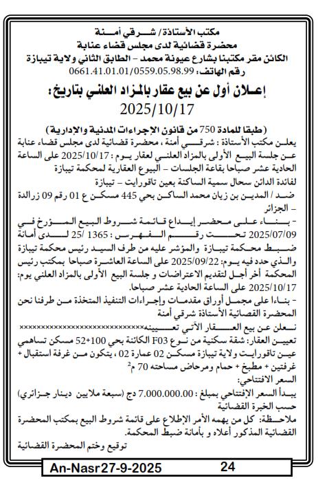 Il sera procédé à la vente au plus offrant et dernier enchérisseur le :