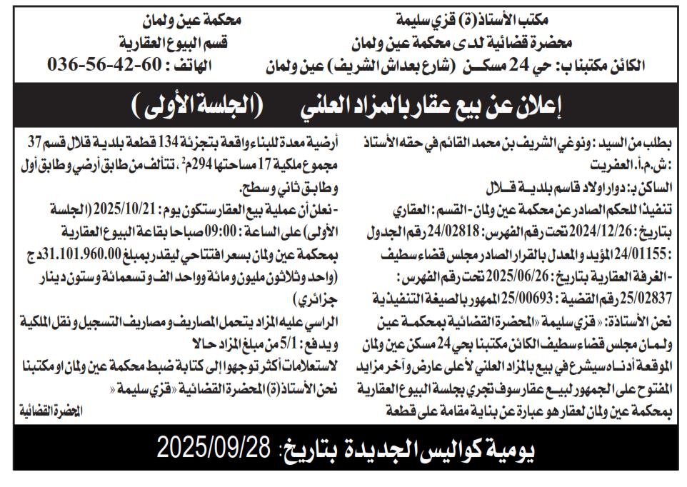 Il sera procédé à la vente au plus offrant et dernier enchérisseur le :