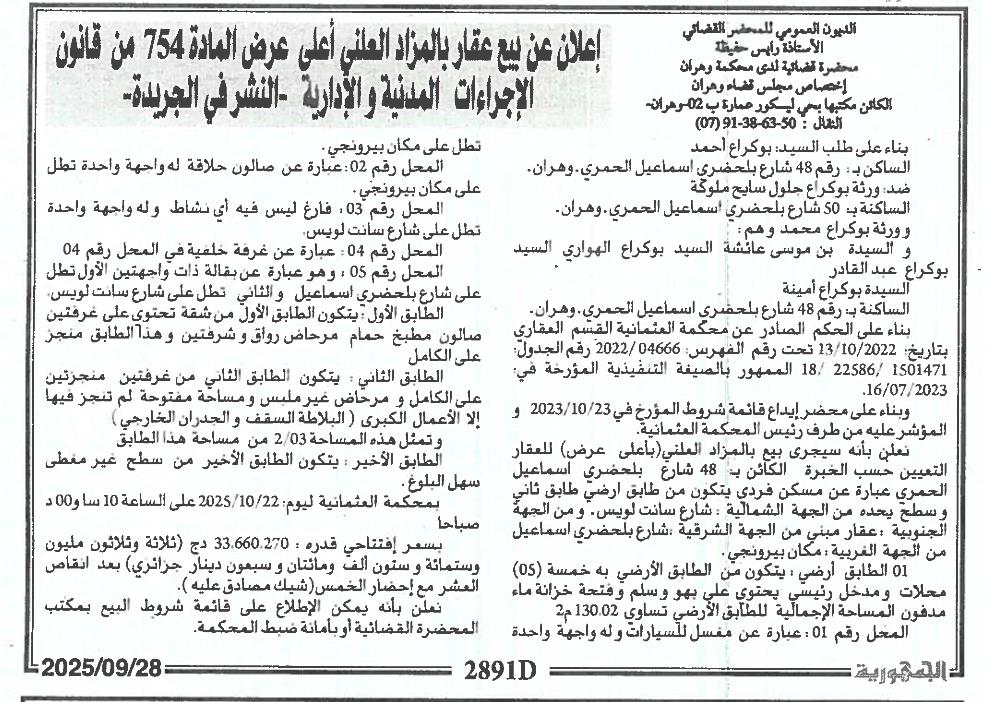 Il sera procédé à la vente au plus offrant et dernier enchérisseur le : 22/10/2025';