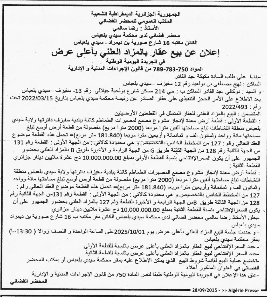 Il sera procédé à la vente au plus offrant et dernier enchérisseur le :