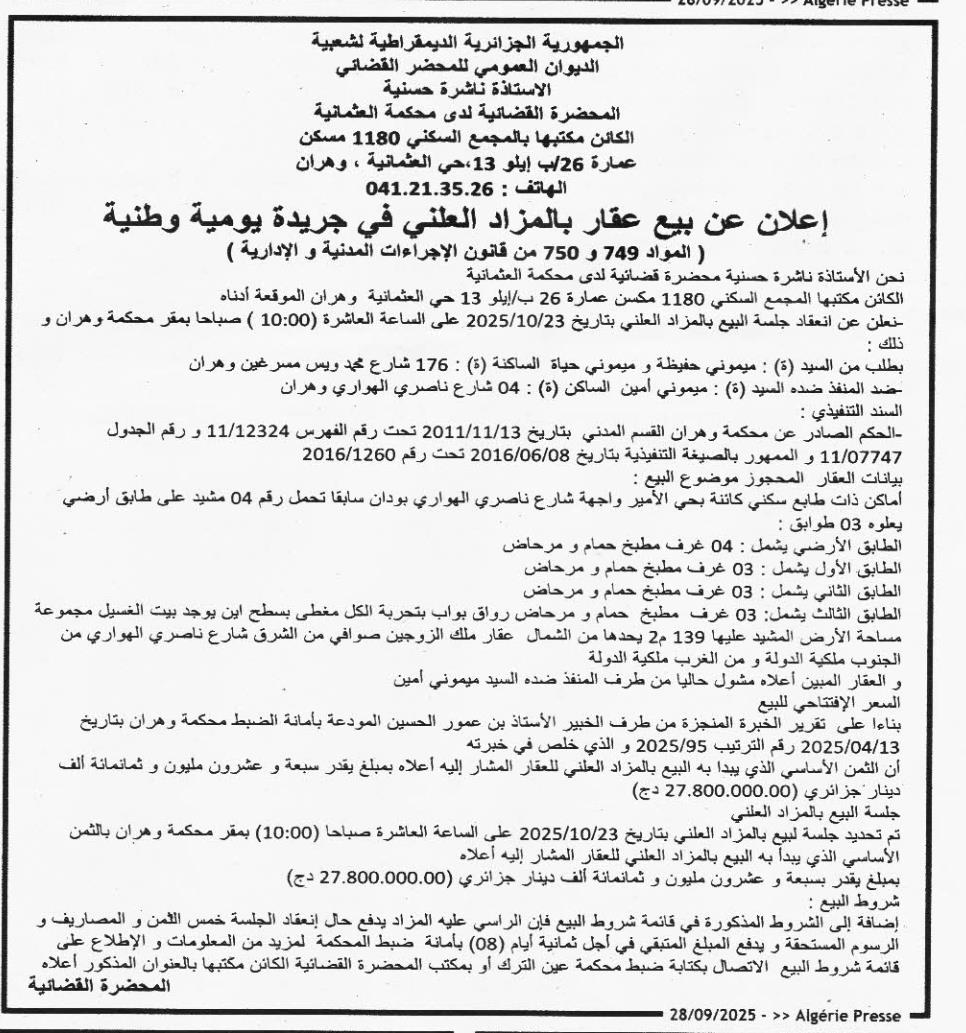 Il sera procédé à la vente au plus offrant et dernier enchérisseur le :
