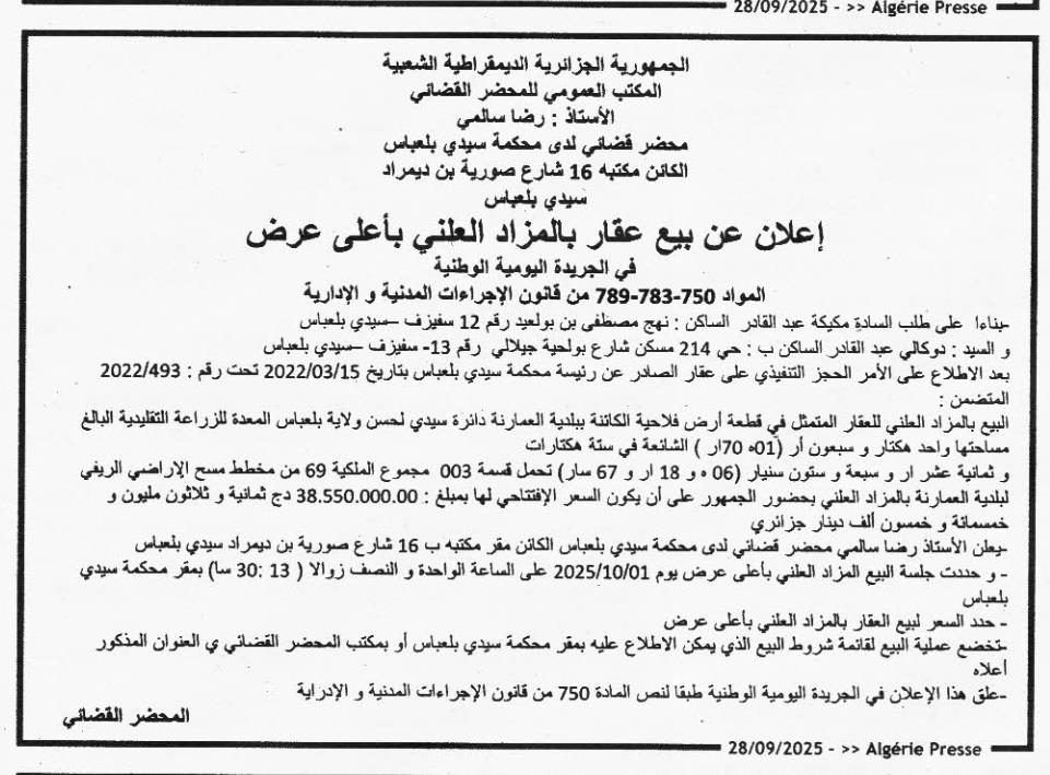 Il sera procédé à la vente au plus offrant et dernier enchérisseur le : 01/10/2025