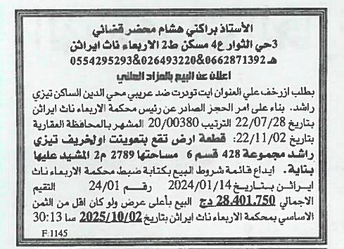 Il sera procédé à la vente au plus offrant et dernier enchérisseur le :