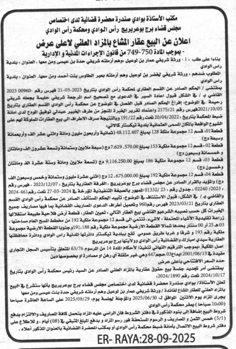 Il sera procédé à la vente au plus offrant et dernier enchérisseur le : 05/10/2025';