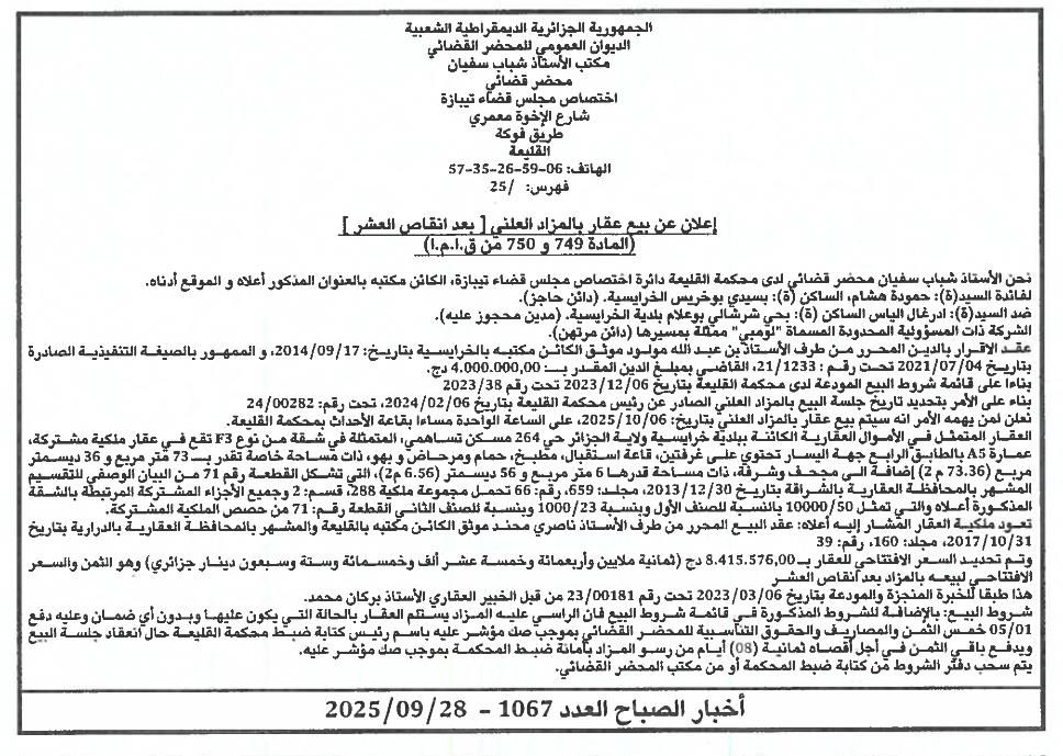 Il sera procédé à la vente au plus offrant et dernier enchérisseur le :