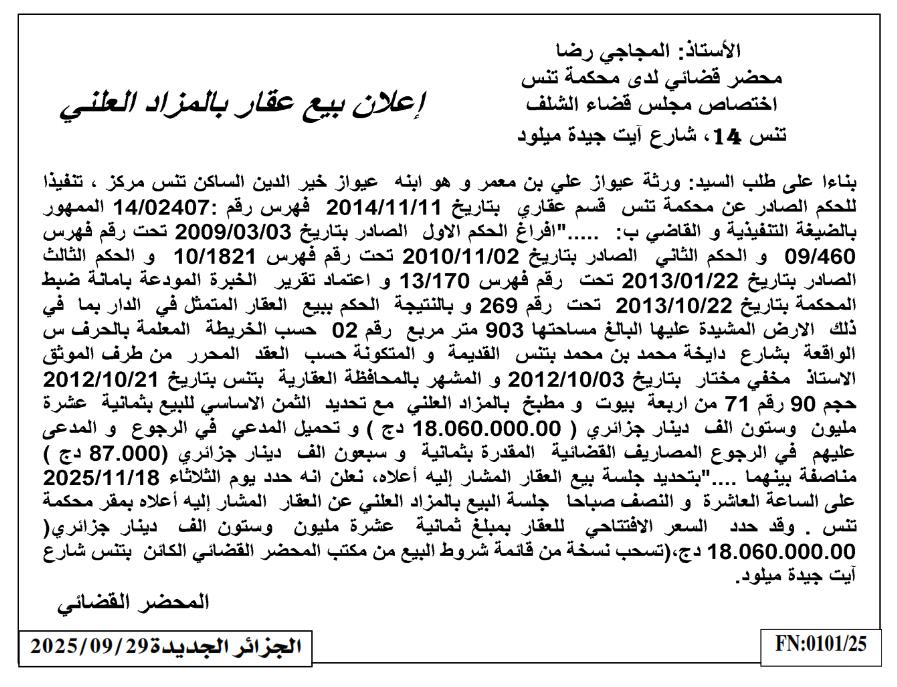 Il sera procédé à la vente au plus offrant et dernier enchérisseur le :