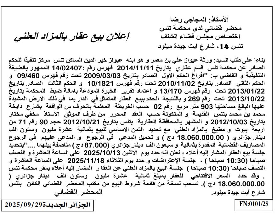 Il sera procédé à la vente au plus offrant et dernier enchérisseur le :