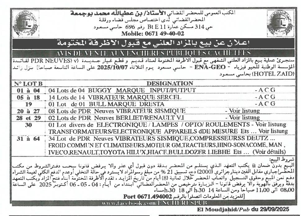 Il sera procédé à la vente au plus offrant et dernier enchérisseur le : 06/10/2025';