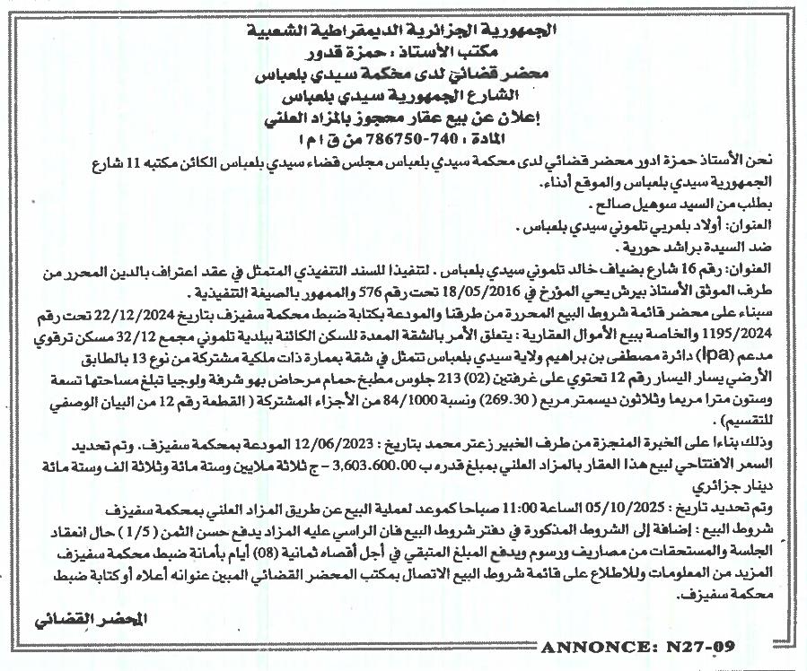 Il sera procédé à la vente au plus offrant et dernier enchérisseur le :