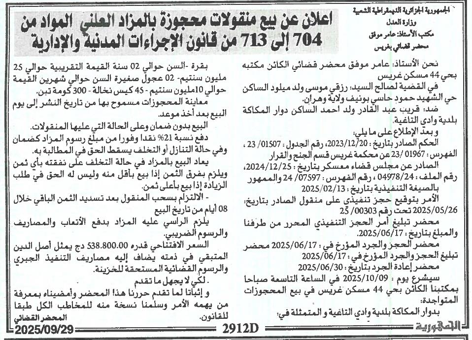 Il sera procédé à la vente au plus offrant et dernier enchérisseur le :
