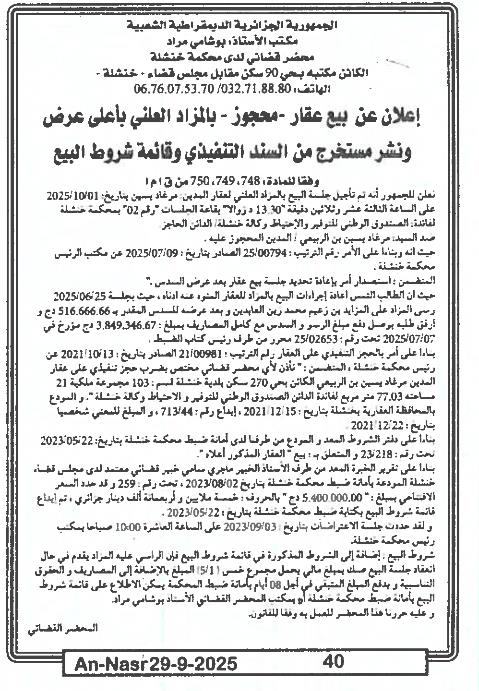 Il sera procédé à la vente au plus offrant et dernier enchérisseur le :