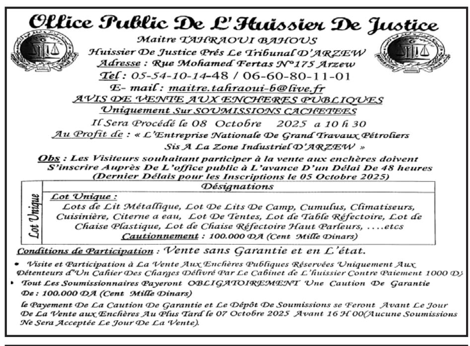 Il sera procédé à la vente au plus offrant et dernier enchérisseur le : 07/10/2025';