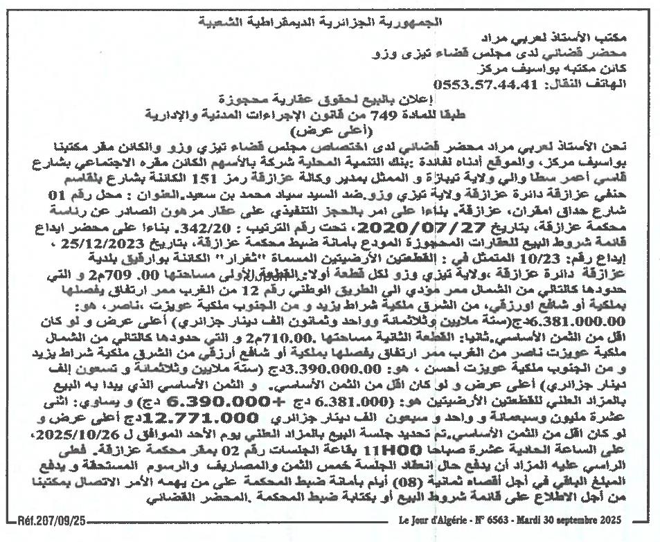 Il sera procédé à la vente au plus offrant et dernier enchérisseur le :