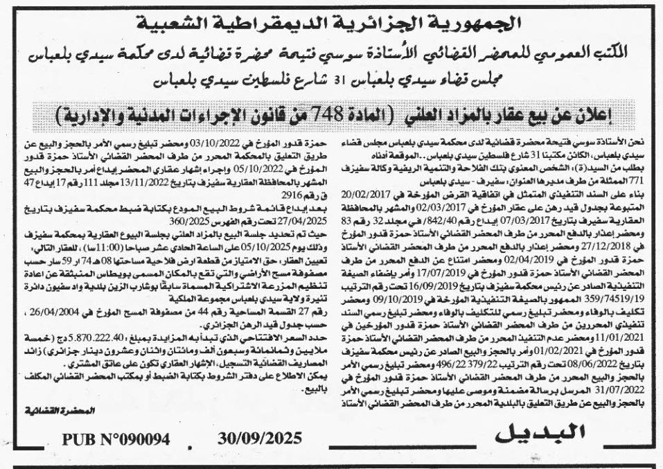 Il sera procédé à la vente au plus offrant et dernier enchérisseur le : 05/10/2025';