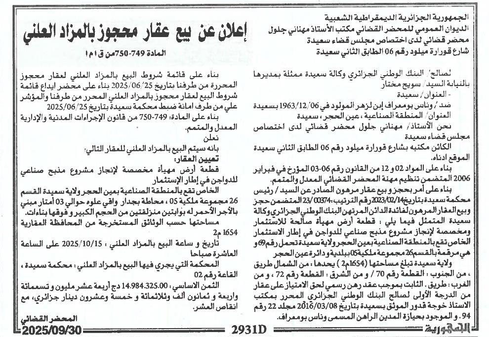 Il sera procédé à la vente au plus offrant et dernier enchérisseur le :