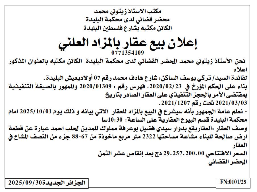 Il sera procédé à la vente au plus offrant et dernier enchérisseur le :