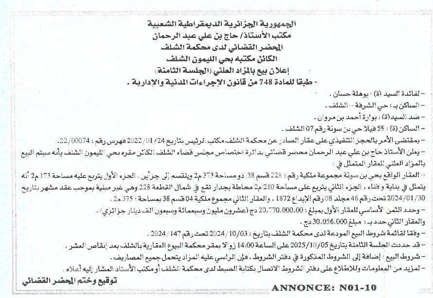 Il sera procédé à la vente au plus offrant et dernier enchérisseur le :