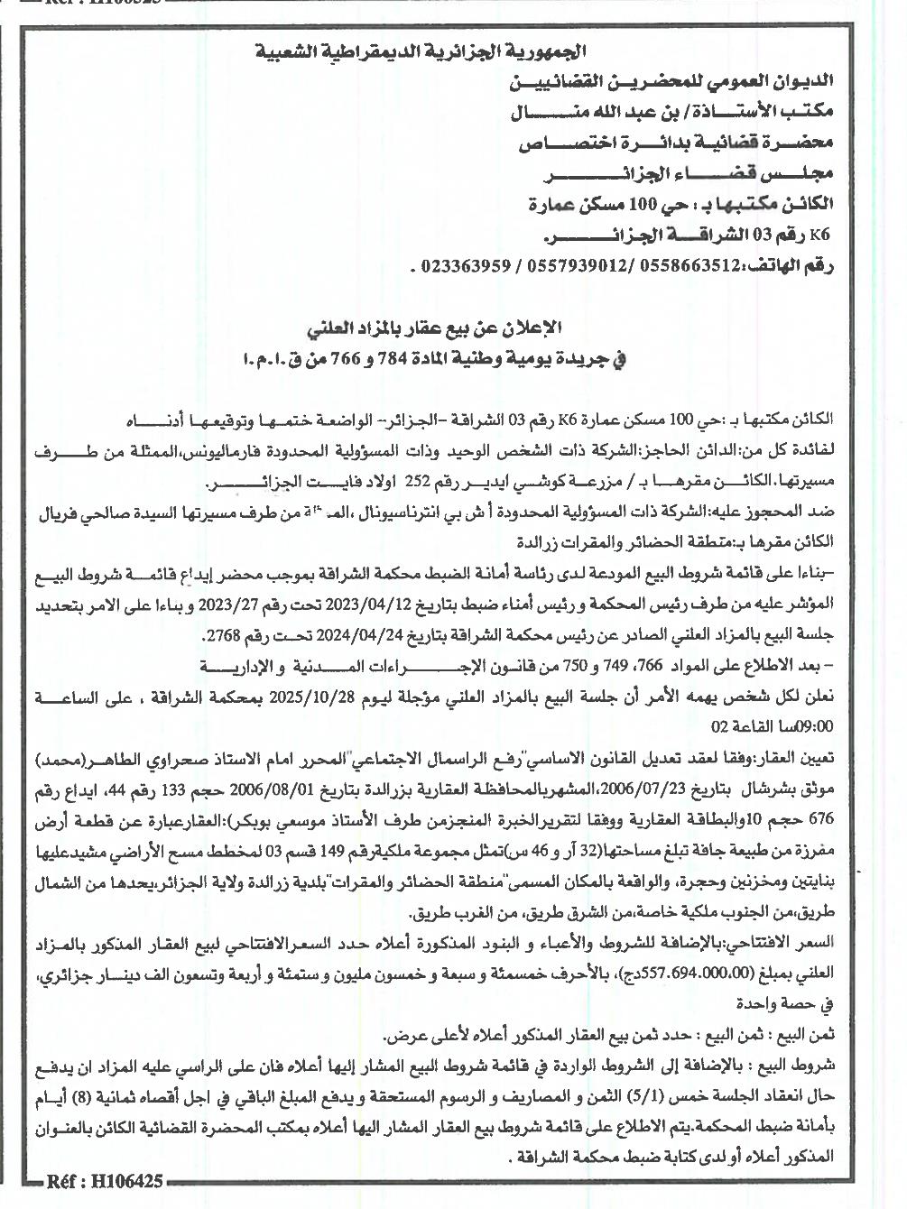 Il sera procédé à la vente au plus offrant et dernier enchérisseur le :