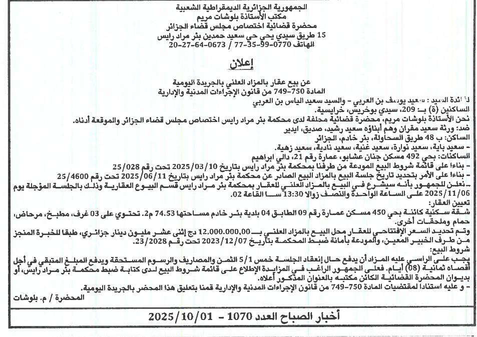 Il sera procédé à la vente au plus offrant et dernier enchérisseur le :