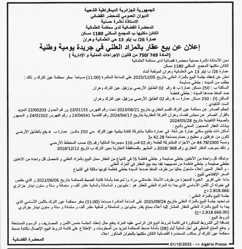 Il sera procédé à la vente au plus offrant et dernier enchérisseur le :
