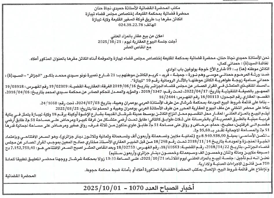 Il sera procédé à la vente au plus offrant et dernier enchérisseur le :