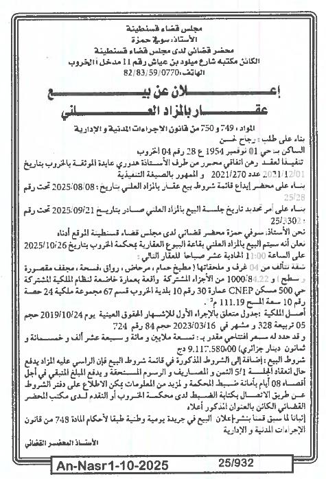 Il sera procédé à la vente au plus offrant et dernier enchérisseur le :