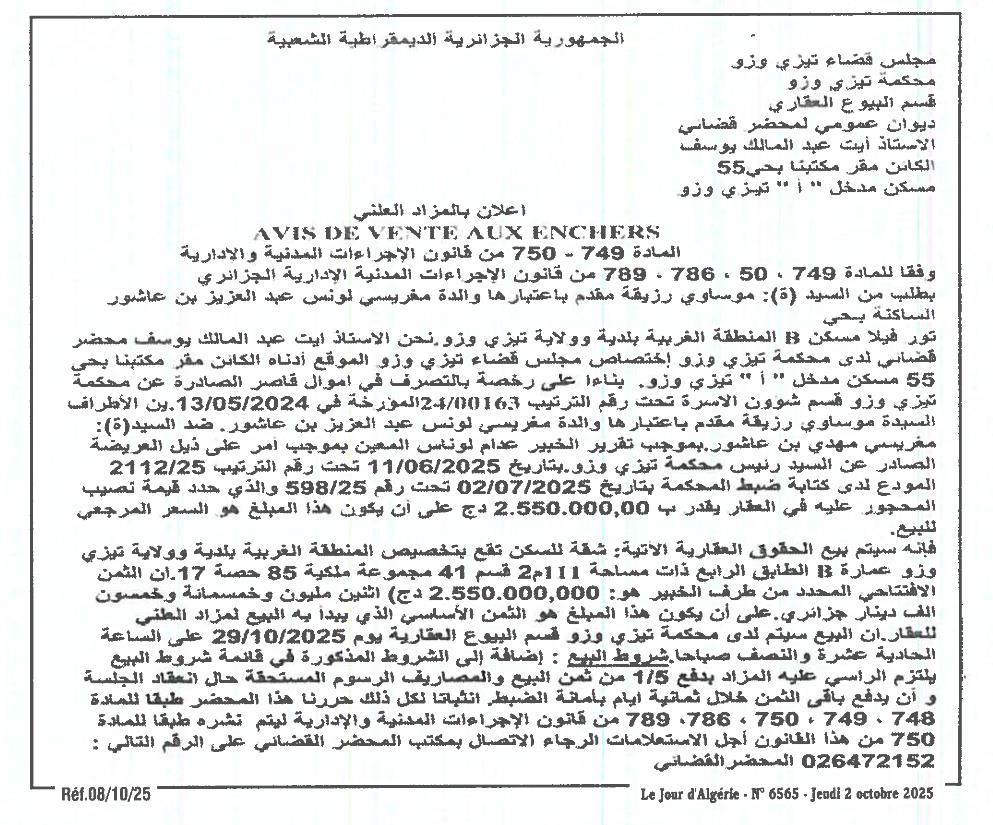 Il sera procédé à la vente au plus offrant et dernier enchérisseur le :