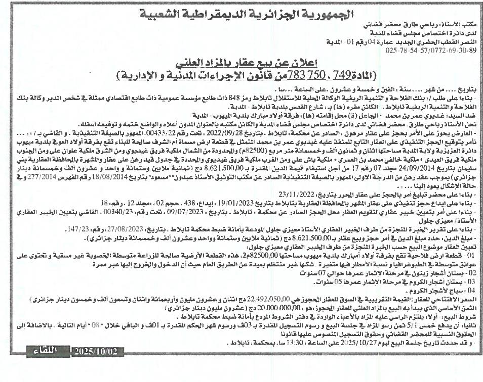 Il sera procédé à la vente au plus offrant et dernier enchérisseur le :