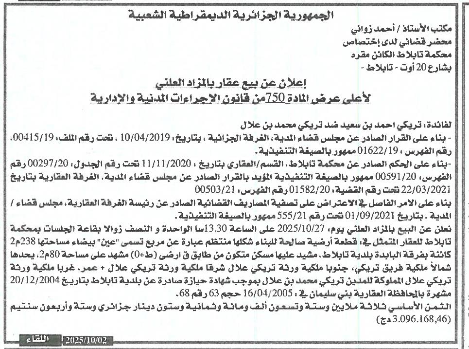 Il sera procédé à la vente au plus offrant et dernier enchérisseur le :