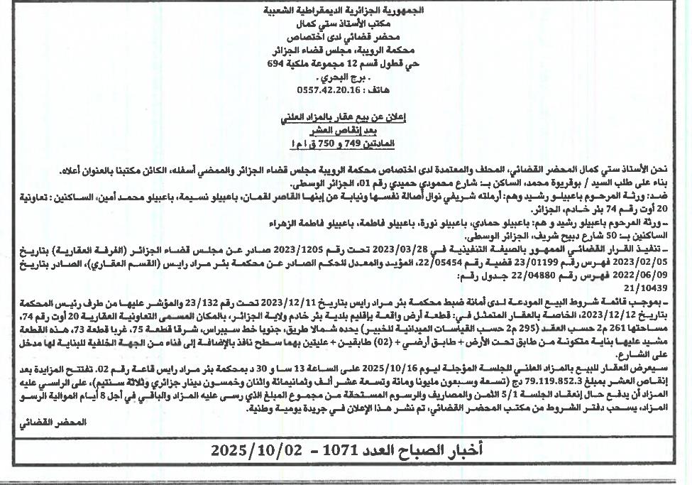 Il sera procédé à la vente au plus offrant et dernier enchérisseur le :