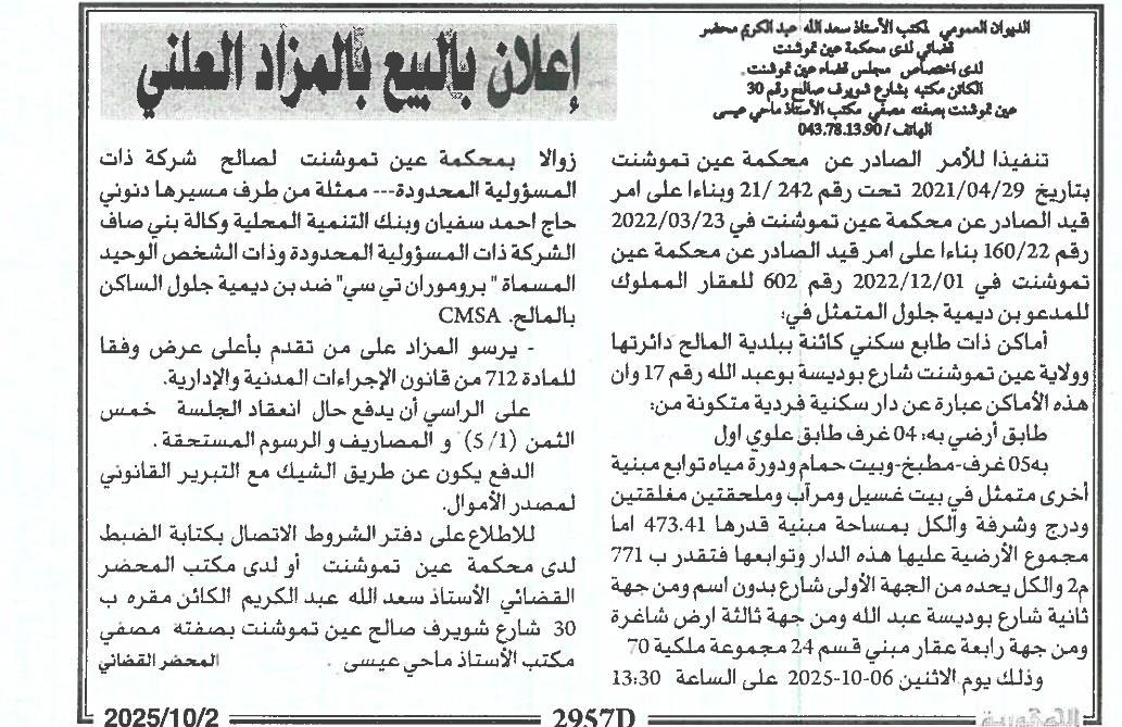 Il sera procédé à la vente au plus offrant et dernier enchérisseur le : 06/10/2025';
