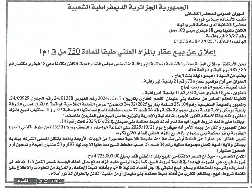 Il sera procédé à la vente au plus offrant et dernier enchérisseur le :