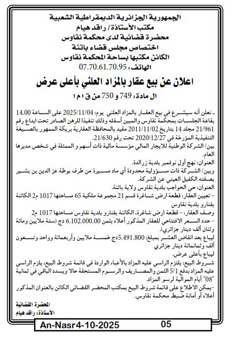Il sera procédé à la vente au plus offrant et dernier enchérisseur le :