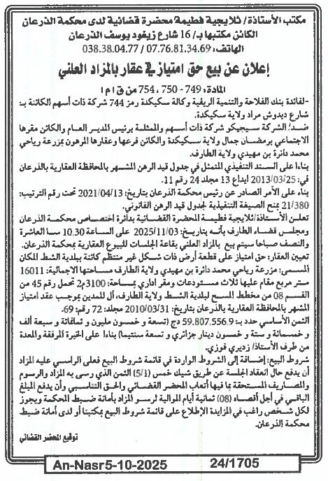 Il sera procédé à la vente au plus offrant et dernier enchérisseur le :