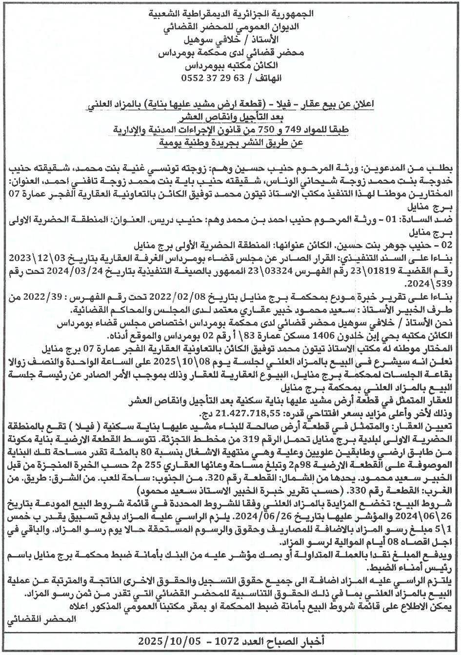 Il sera procédé à la vente au plus offrant et dernier enchérisseur le :