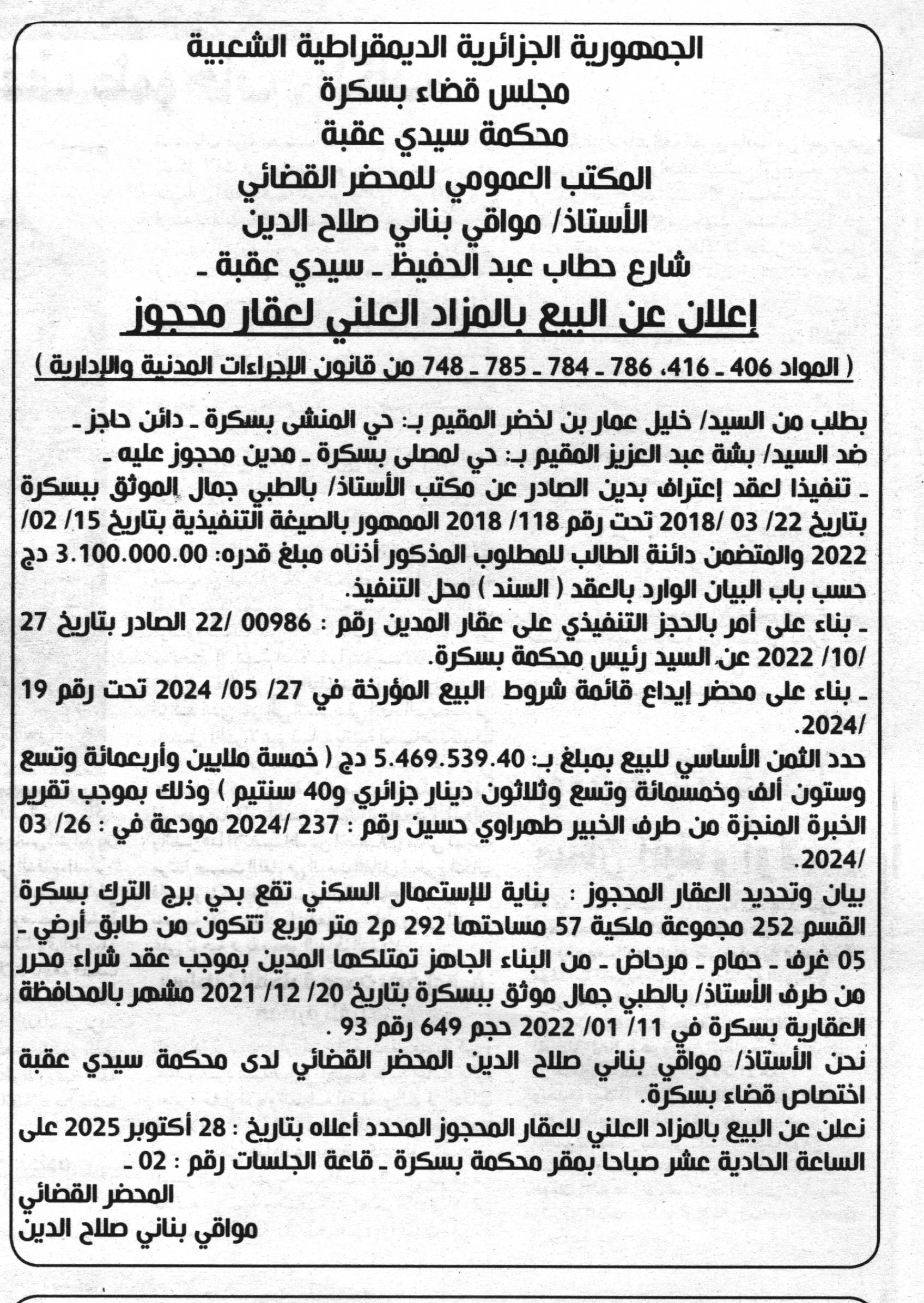Il sera procédé à la vente au plus offrant et dernier enchérisseur le :