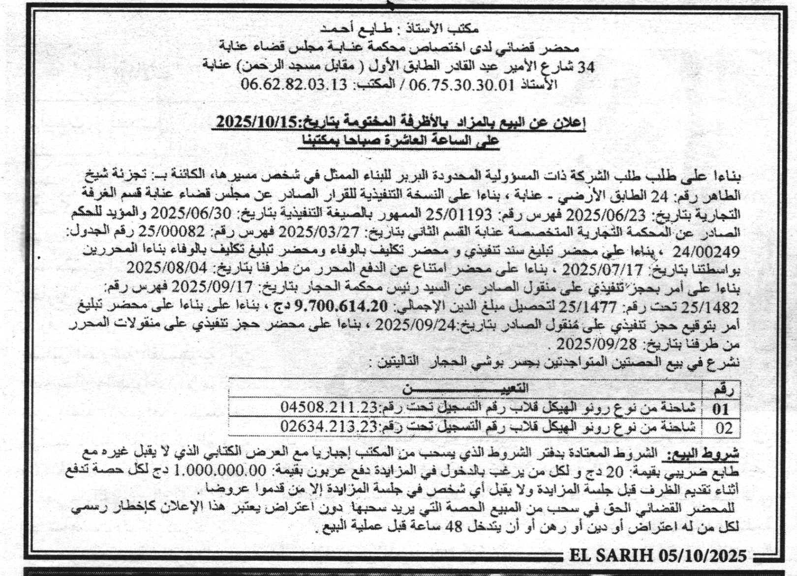 Il sera procédé à la vente au plus offrant et dernier enchérisseur le :