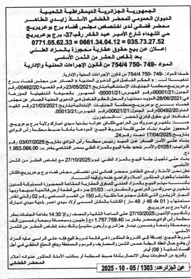 Il sera procédé à la vente au plus offrant et dernier enchérisseur le : 12/10/2025';