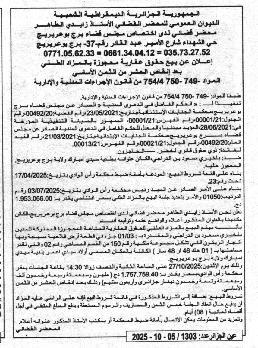 Il sera procédé à la vente au plus offrant et dernier enchérisseur le : 12/10/2025';