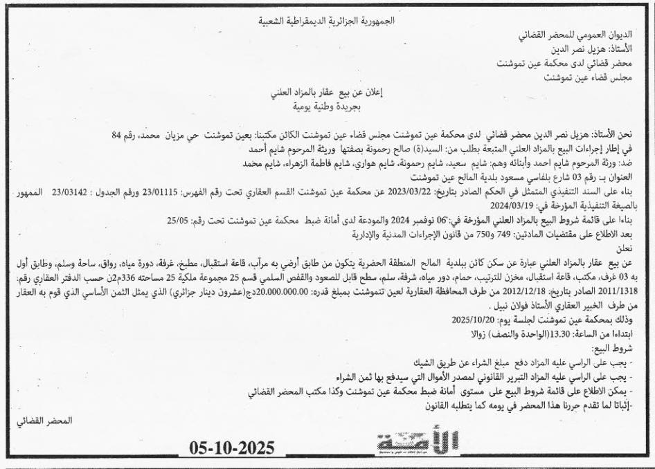 Il sera procédé à la vente au plus offrant et dernier enchérisseur le :