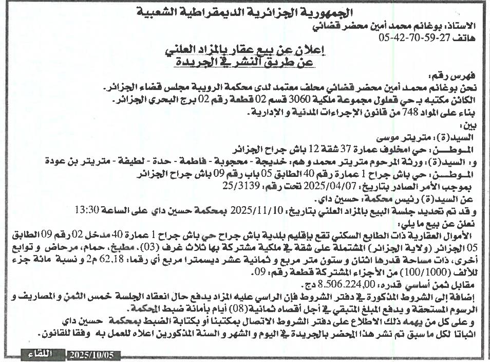 Il sera procédé à la vente au plus offrant et dernier enchérisseur le :