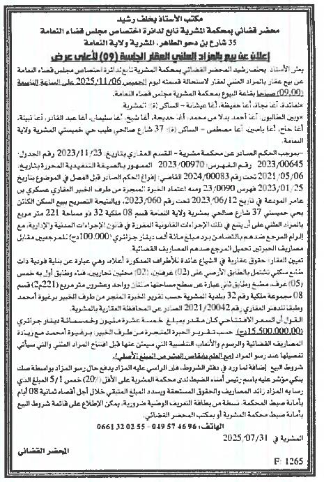 Il sera procédé à la vente au plus offrant et dernier enchérisseur le :