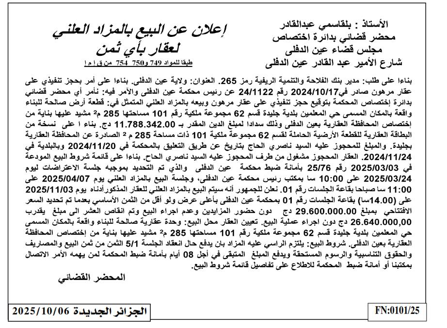 Il sera procédé à la vente au plus offrant et dernier enchérisseur le :