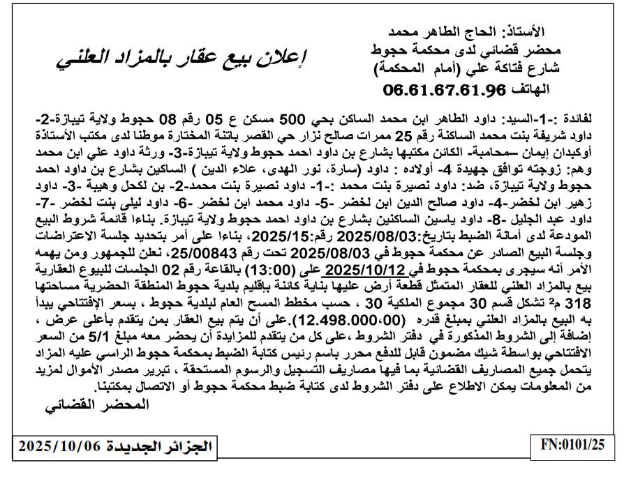 Il sera procédé à la vente au plus offrant et dernier enchérisseur le :